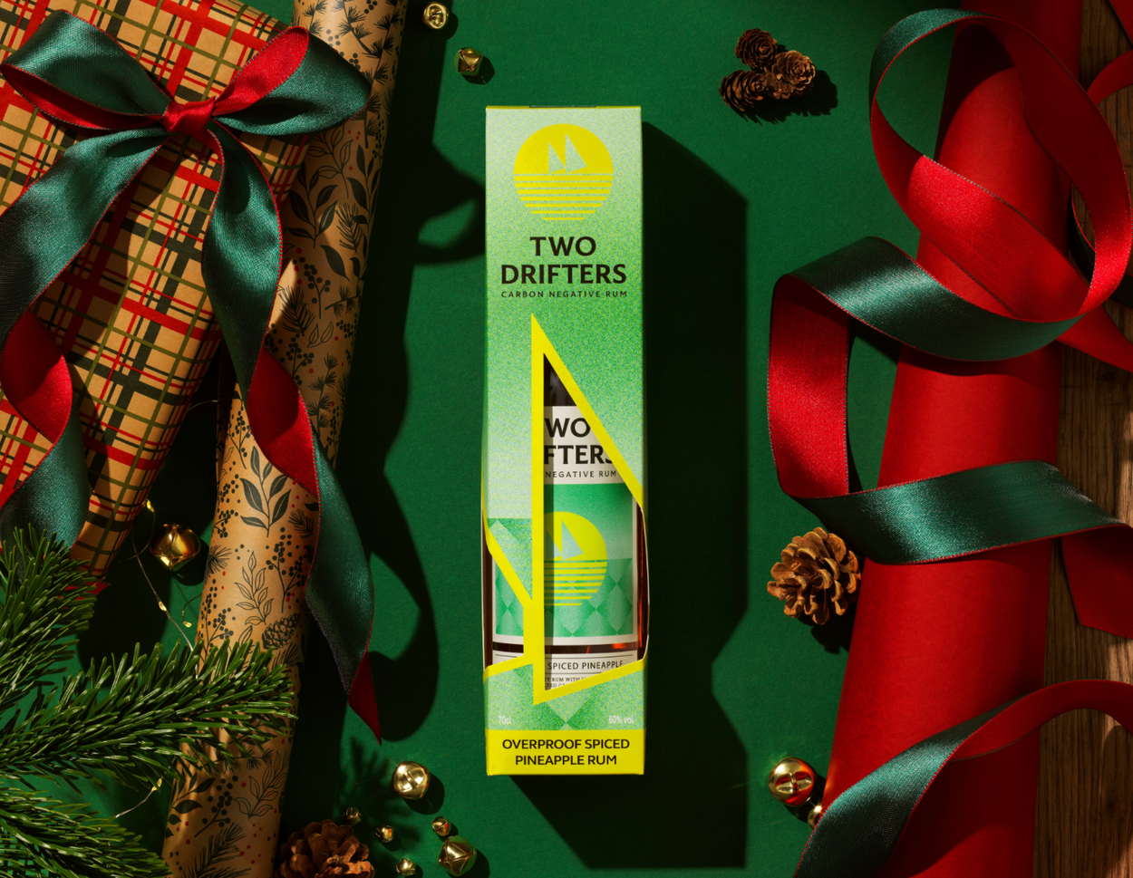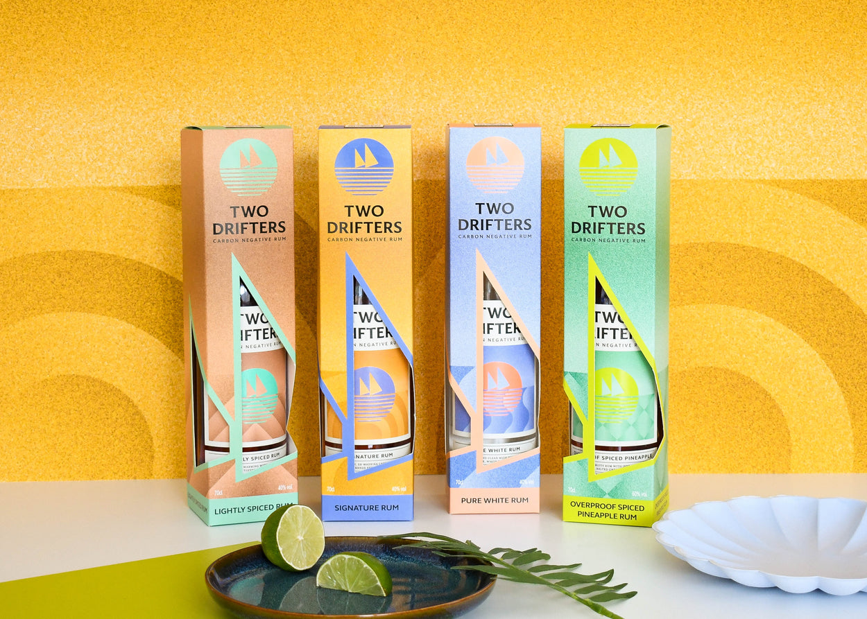 Give the gift of beautiful, delicious, sustainable rum, with this custom gift box. Made from World Land Trust card, this box maintains our carbon negative footprint. Add a gift note in Checkout, and will send your note on a Two Drifters cocktail postcard. Each bottle of Two Drifters Rum removes over 1 kg of CO2 from the atmosphere.